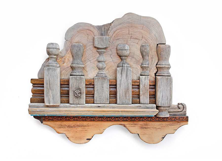 "Six Columns", 2024. Olive wood, found wood objects, clear coat.
